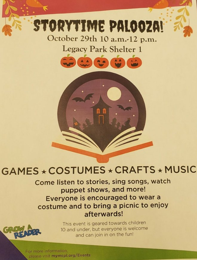 Storytime Palooza Fall Edition, October 29th, Legacy Park, Lees Summit, MO from 10 am, to noon.